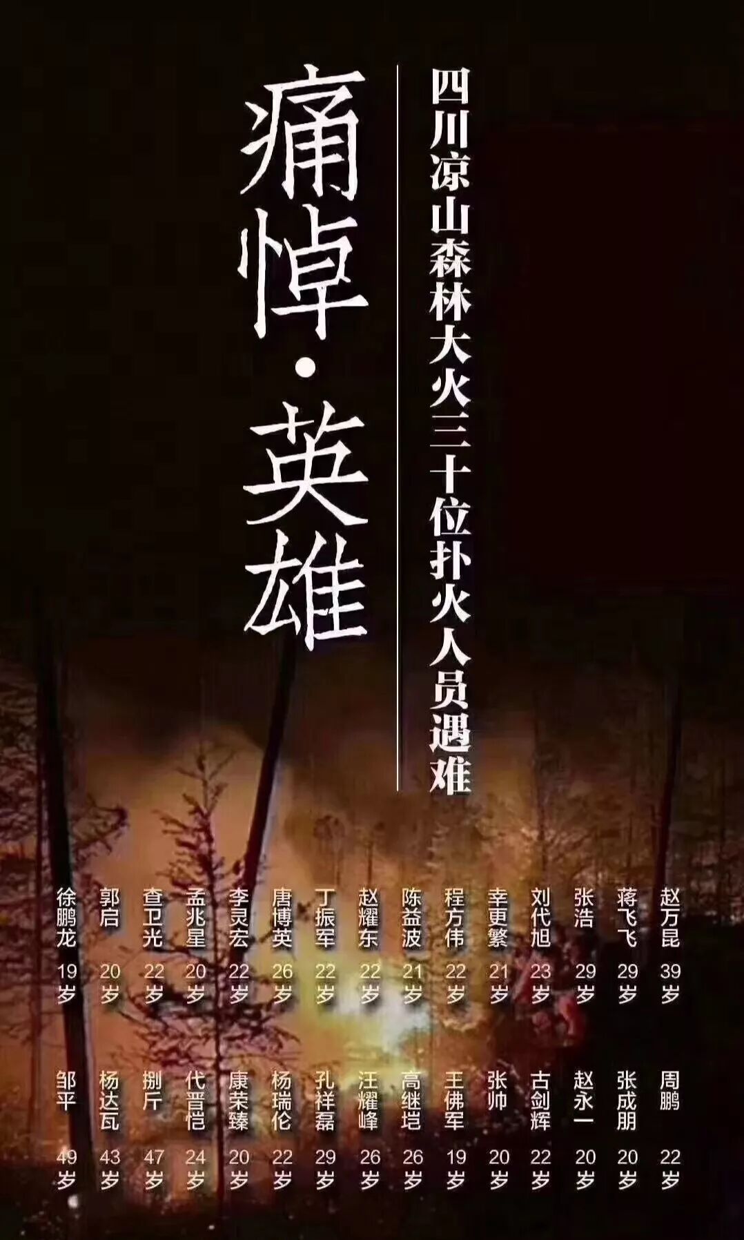 3月30日下午5点,四川省凉山州突发林火,熊熊烈焰顷刻间吞没了30位扑火英雄,30个家庭支离破碎,牵动了整个中国的心。有种悲痛在心口难排,让我们为逝者痛哀,愿他们来世一生平安。